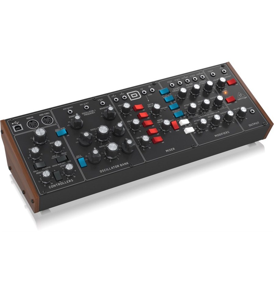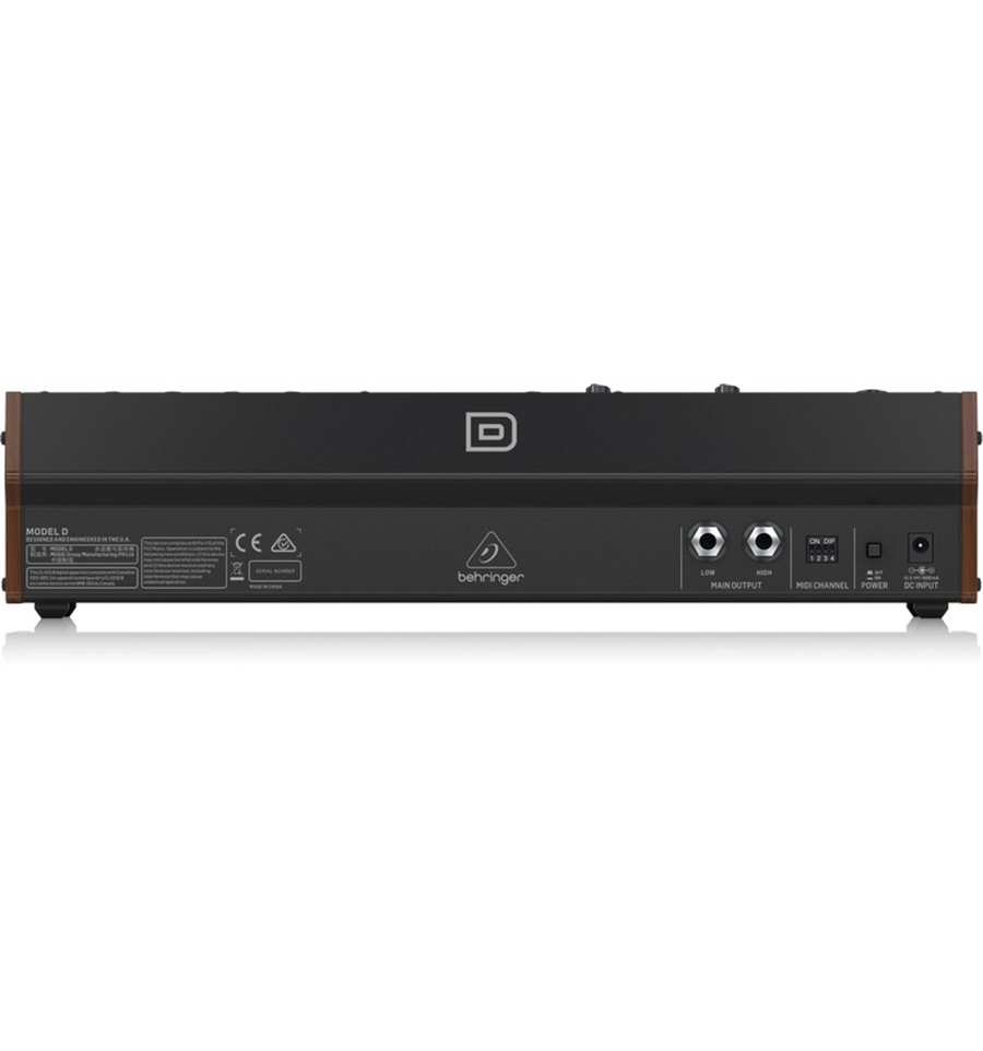 Behringer Model D je monofonijski analogni sintesajzer i autentična replikacija legendarnog Minimoog Modela D sa identičnim tranzistorima, otpornicima i kondenzatorima. Potpuno analogna signalna putanja VCO, VCF i VCA, kao i klasični 24dB filtar omogućuju nevjerojatno vjerne i prepoznatljive zvukove. Osim toga, model D nudi i druge funkcije kao što je karakteristika filtra koja se može prebacivati između low / high pass i polu-modularnog dizajna, što znači da se Behringer Model D savršeno integrira u modularni Eurorack kao kompletan synth.